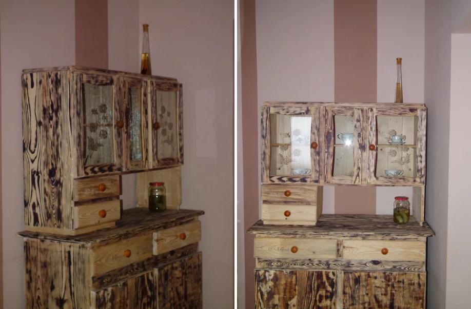 Обработанные и ровные плоскости обрабатывается специальной структурирующей тонировкой для дерева. Декоративный тонирующий цвет выбирайте темнее первоначального оттенка шкафа. Такая обработка полностью преобразит внешний вид изделия.