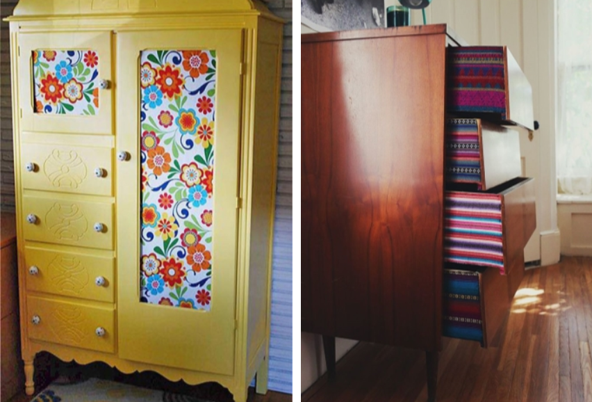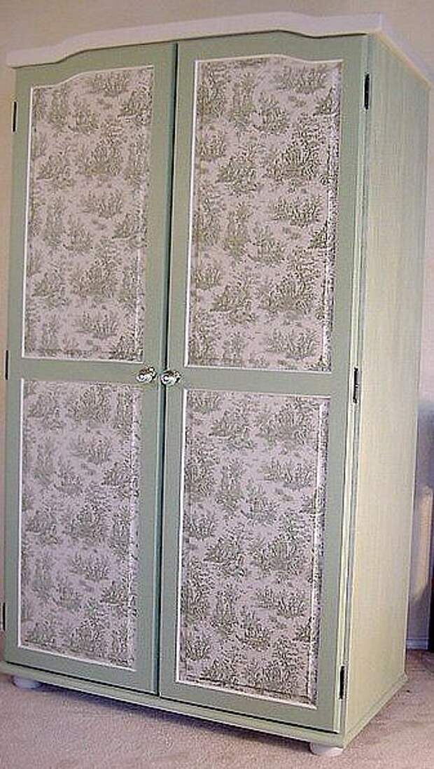 - Ткань. Необычная идея обновления корпусной мебели типа шкафа при помощи ткани. Прямоугольные формы можно смягчить такой отделкой, при этом в любой момент можно заменить материал легко и быстро. Для декорации понадобится ткань, поролон, мебельный степлер. Ткань натягивается на поверхность корпуса, закрепляется скобами или жидкими гвоздями.