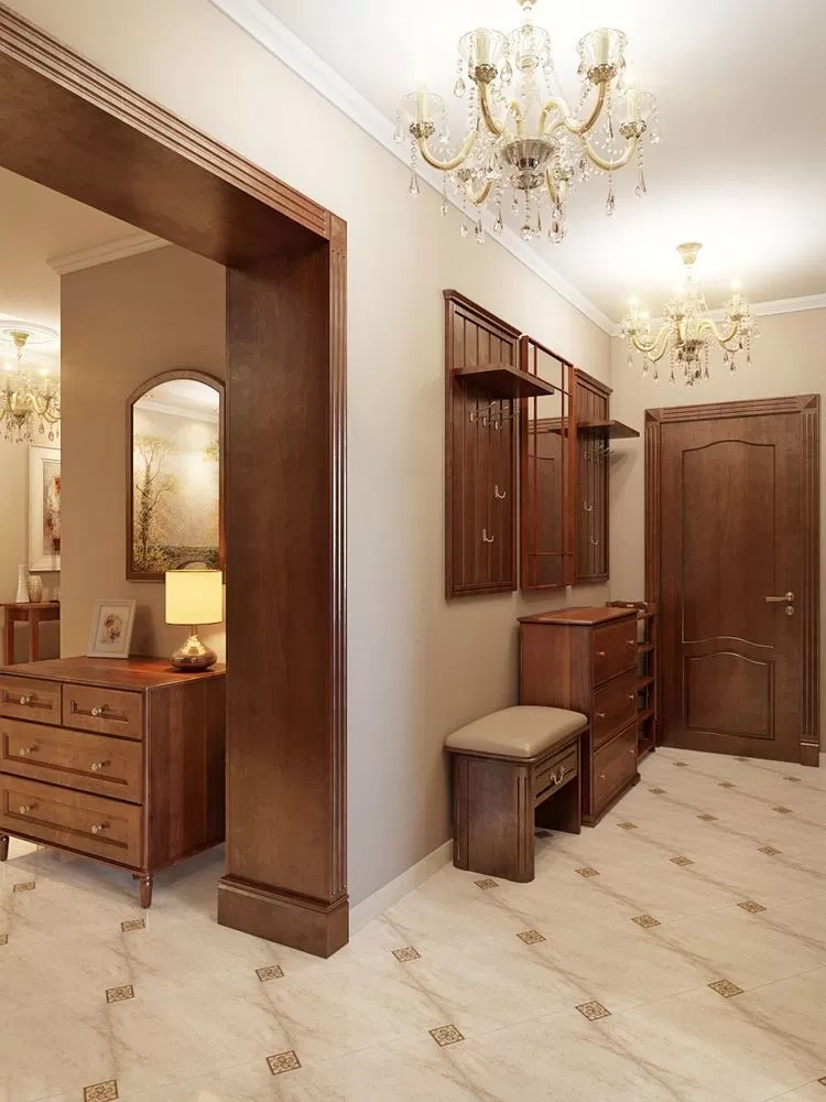 - Если в вашем доме просторный коридор в форме квадрата, то его можно превратить в холл в английском или классическом стиле. Используйте светлые краски, лепные украшения и бра в виде подсвечников.