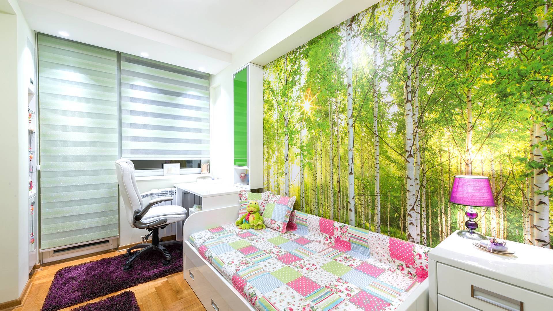 Интересного эффекта можно достичь, если использовать фотообои с эффектом 3D, когда уходящая вдаль перспектива на одной стене уводит на природу, а с другой стороны имитирует дверь. Правда, получится ощущение проходной комнаты, зато она будет казаться намного больше, чем на самом деле.