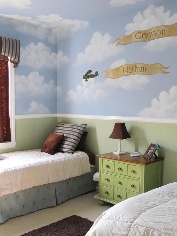 Голубые потолочные обои, увеличивающие пространство комнаты, как бы открывают небо над головой. В этом случае не используют припотолочные люстры. Но этот прием не подходит для людей с боязнью открытого пространства. Зато очень живописно смотрится такой потолок с веточками цветущей сакуры или свисающей хвоей на фотообоях. Тогда получается не только эффект расширения пространства и отрытого неба, но и создается ощущение близости с природой. В спальне также уместен эффект звездного неба на потолке.