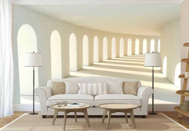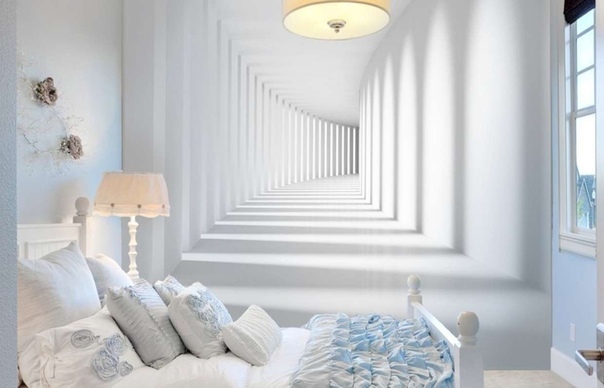 Интересного эффекта можно достичь, если использовать фотообои с эффектом 3D, когда уходящая вдаль перспектива на одной стене уводит на природу, а с другой стороны имитирует дверь. Правда, получится ощущение проходной комнаты, зато она будет казаться намного больше, чем на самом деле. Еще больше впечатляют художественные коллажи из обоев и зрительные иллюзии, где трехмерное изображение как бы все время движется. Однако мнительным и пугливым людям, а также личностям с психическими отклонениями такие обои противопоказаны.