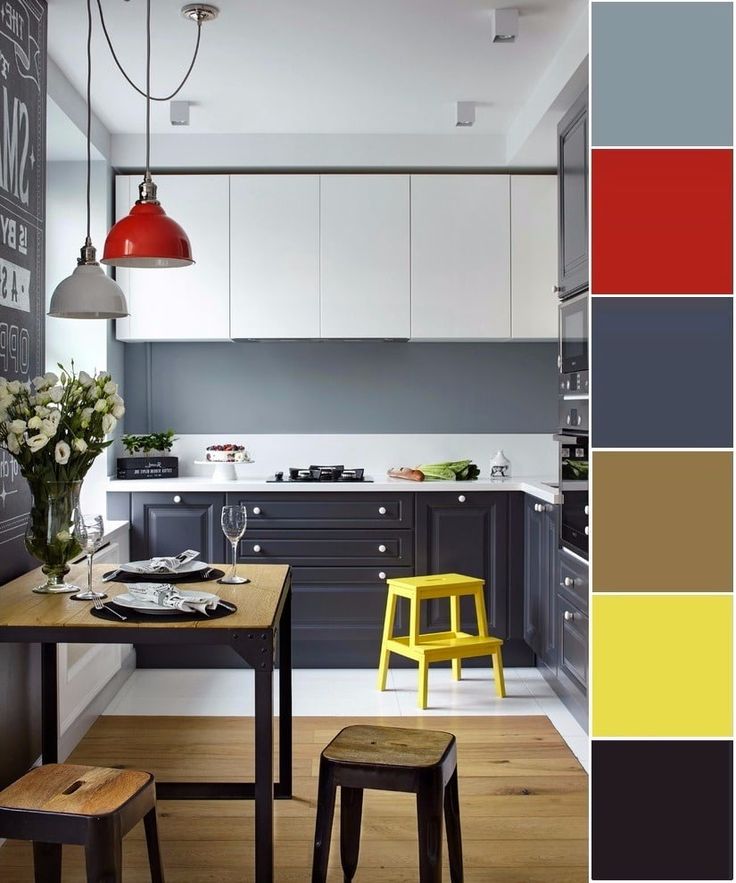 Белый, красный, синий, зеленый, розовый, желтый, серый или черный цвета стен лучше всего сочетаются с серыми кухонными шкафами, чтобы декор выглядел элегантно и модно.
