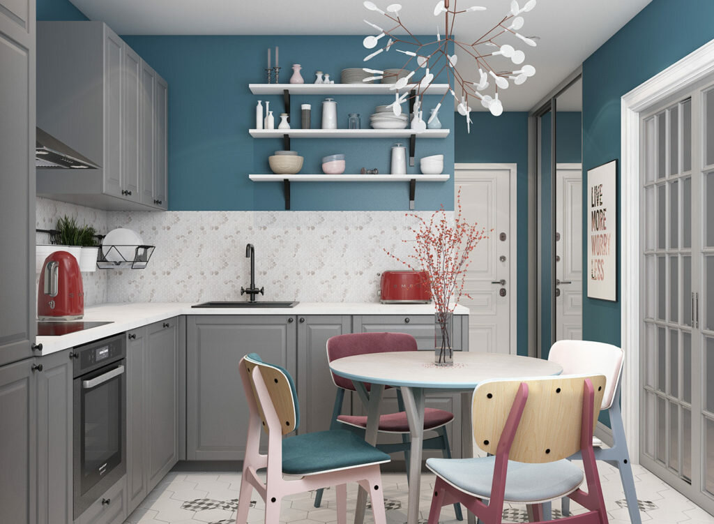 Стены темно-синего или небесно-голубого цвета в сочетании со светло-серыми шкафами — бесспорно выигрышная комбинация. Эти два цвета легко сочетаются друг с другом для создания креативного и уникального стиля.