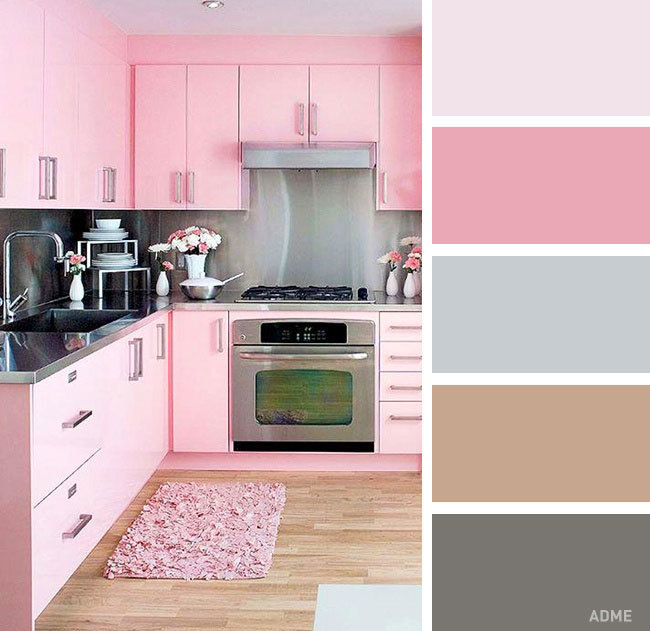 Светлый или средний оттенок розового со светло- или темно-серыми шкафами будет выглядеть стильно, элегантно и красиво. Соедините это с белой или черной столешницей, и ваш кухонный декор будет в лучшем виде.