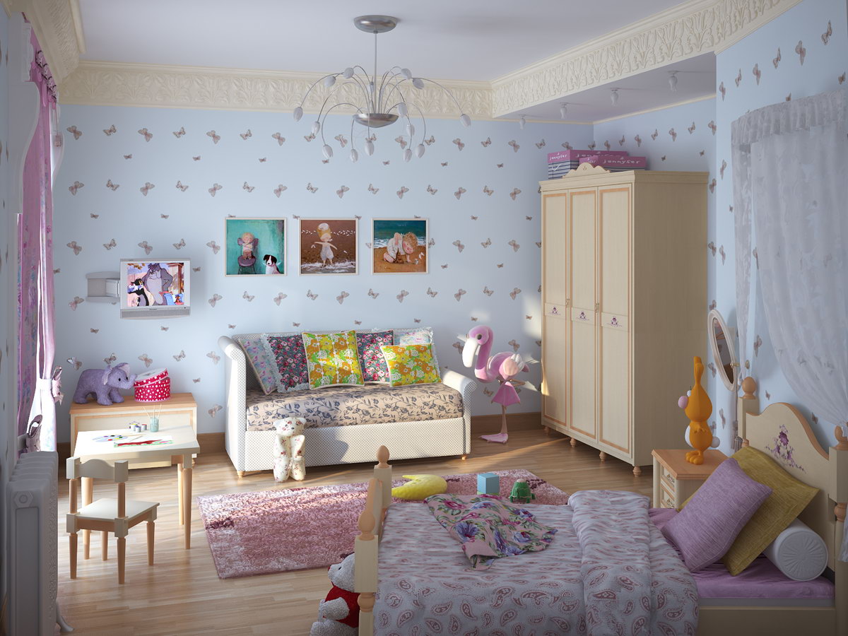 Красиво в девичьем интерьере смотрится картина, написанная акварельными красками спокойных тонов. Уместны изображения фей, принцесс, сказочных единорогов. Также детские картины могут быть с любимыми героями сказок, фильмов, персонажей из книг. Для девочек постарше подойдут полотна с изображением балерин, художниц, танцовщиц и т.д. Если девочка хорошо рисует, можно повесить в комнате ее работы.