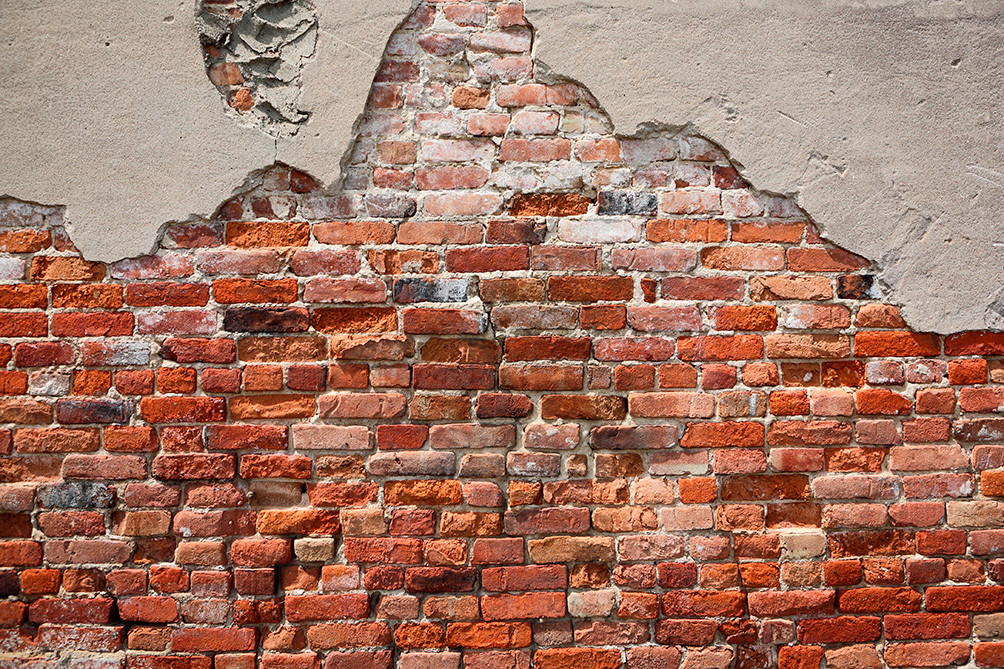 Die alte beschΓ€digte Ziegelmauer mit Gipsflecken