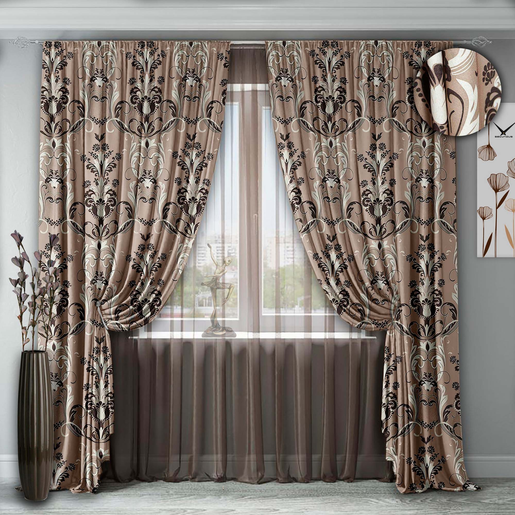 Длинные винтажные шторы с завязками и принтом в виде листьев растений