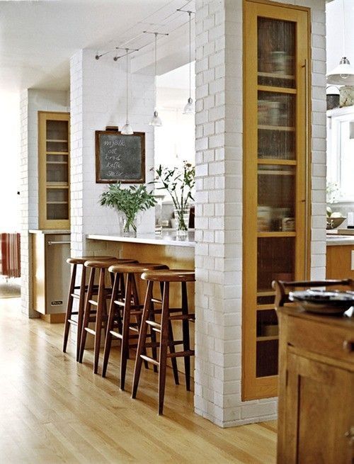 Другим уникальным подходом к сокрытию колонн является использование деревянной облицовки, чтобы замаскировать их под дверные рамы. В этом примере расстояние между колоннами было очень симметричным, что создавало иллюзию трехпанельных дверей/арочных проемов. Отделка белой краской идеально сочетается с белыми кухонными шкафами, поэтому она не выглядит неуместной в общем дизайне.