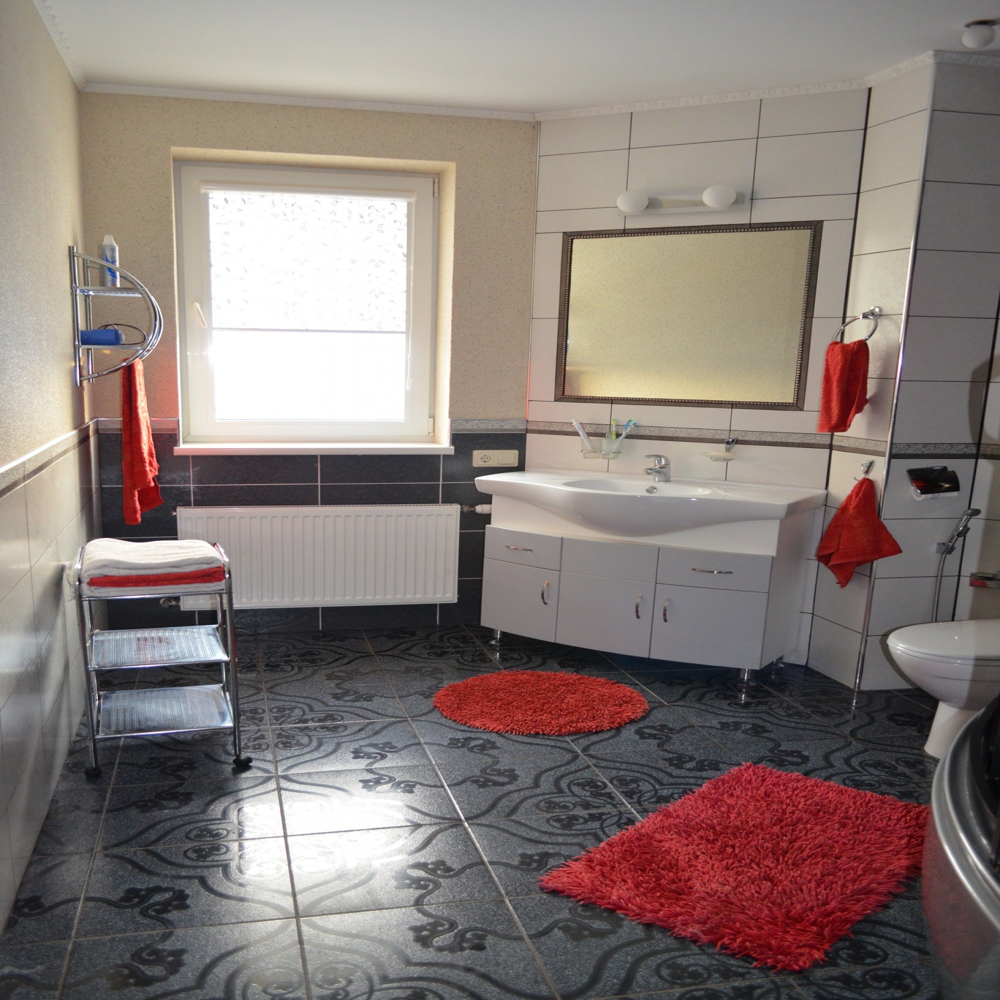 - При оформлении просторной ванной красная гамма станет наиболее привлекательным вариантом.
