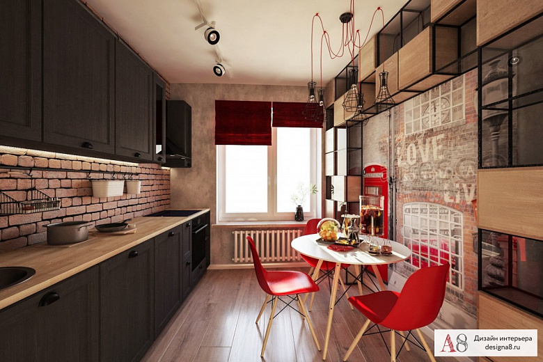 Если есть возможность сделать кухню-гостиную или столовую — супер. Нестандартная планировка и форма помещения идёт лофту на пользу. В квартире с кухней-прямоугольником сложнее, но варианты при минимальных затратах получить приемлемый дизайн есть.