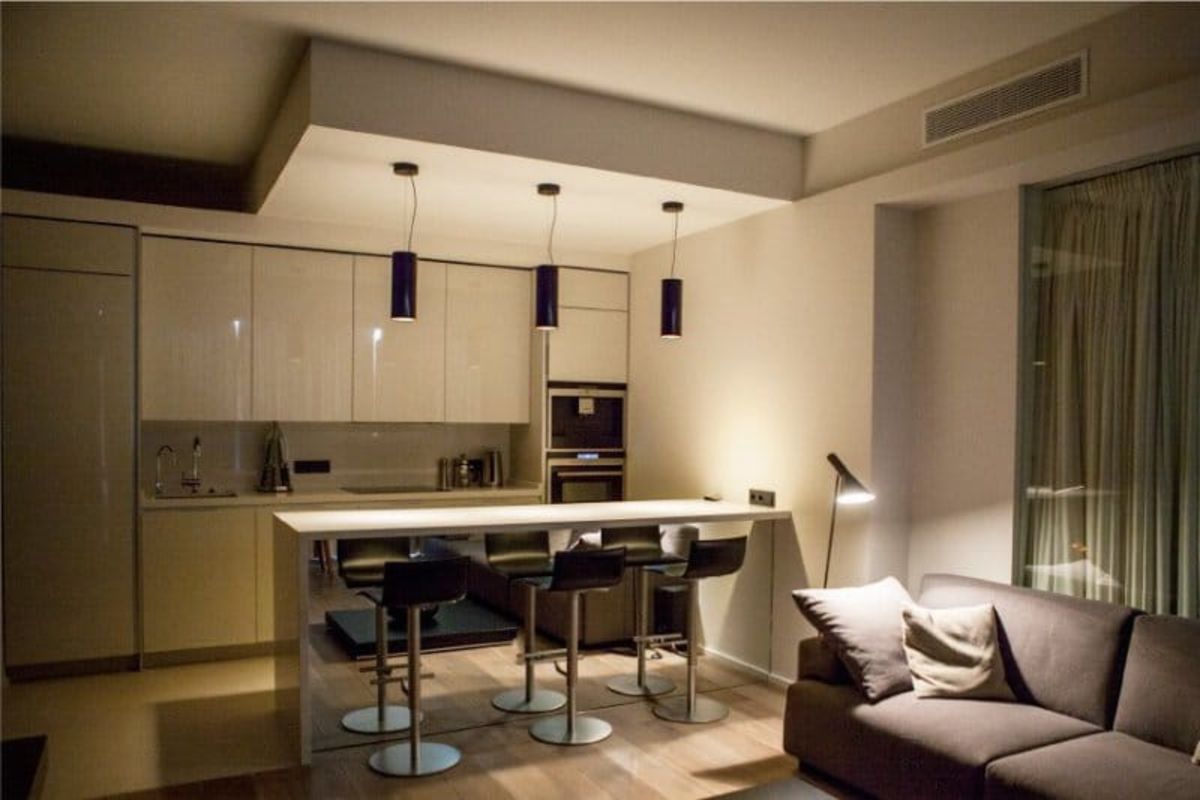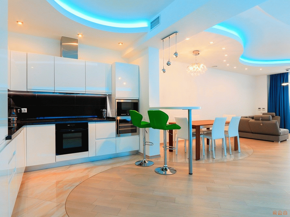 Оригинальным методом разделения потолка в совмещенных комнатах также считается использование разнообразного освещения. В этом случае над обеденным столом рекомендуется повесить классическую люстру, а возле дивана бра. Что же касается территории кухни, то для нее лучным вариантом считается установка точечных светильников. Они смогут не только ярко освещать помещение, но и создавать романтический уютный свет. Очень важно чтобы освещение рабочей зоны кухни было направленным.