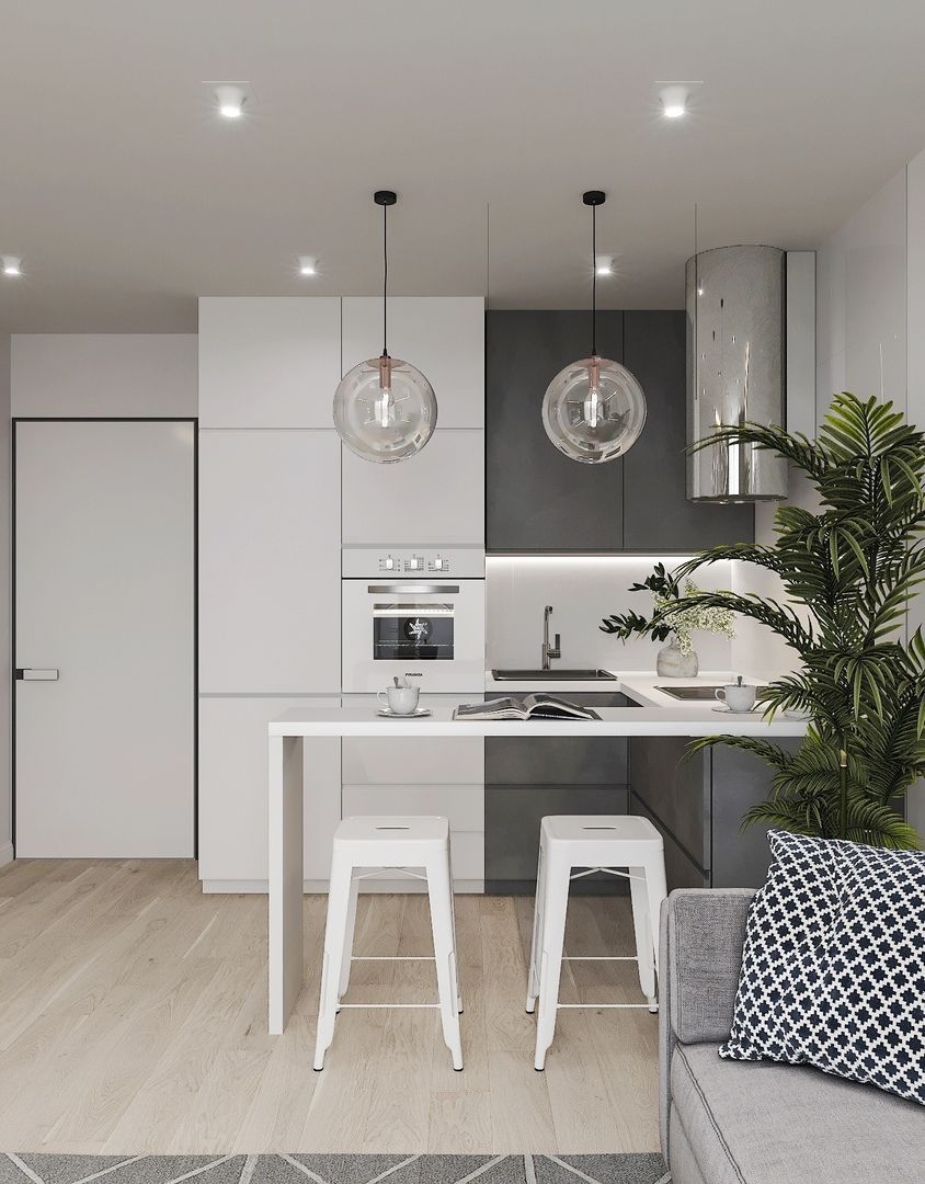 Если достаточно дивана на двух-трех человек и барной стойки, то кухню можно сделать и побольше. Вместе с барной стойкой она может быть в форме буквы П, тогда граница между кухней и жилой зоной будет довольно четкой. Особенно такая планировка актуальна если комната имеет форму вытянутого прямоугольника.