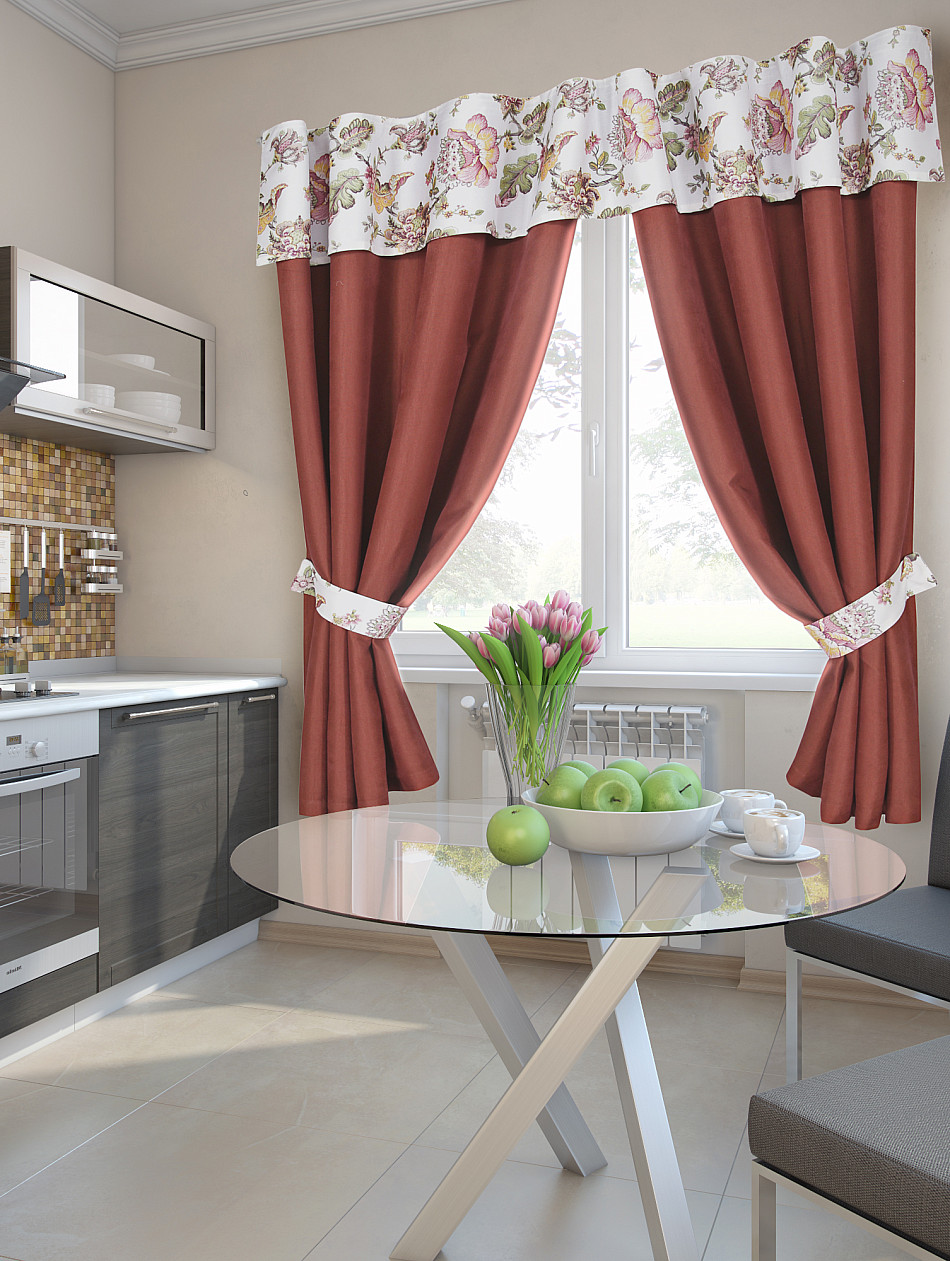 - Размеры помещения. Как обычно, на кухне небольшого размера актуальными станут светлые шторы, в более просторных помещениях можно использовать светлые и темные тона.