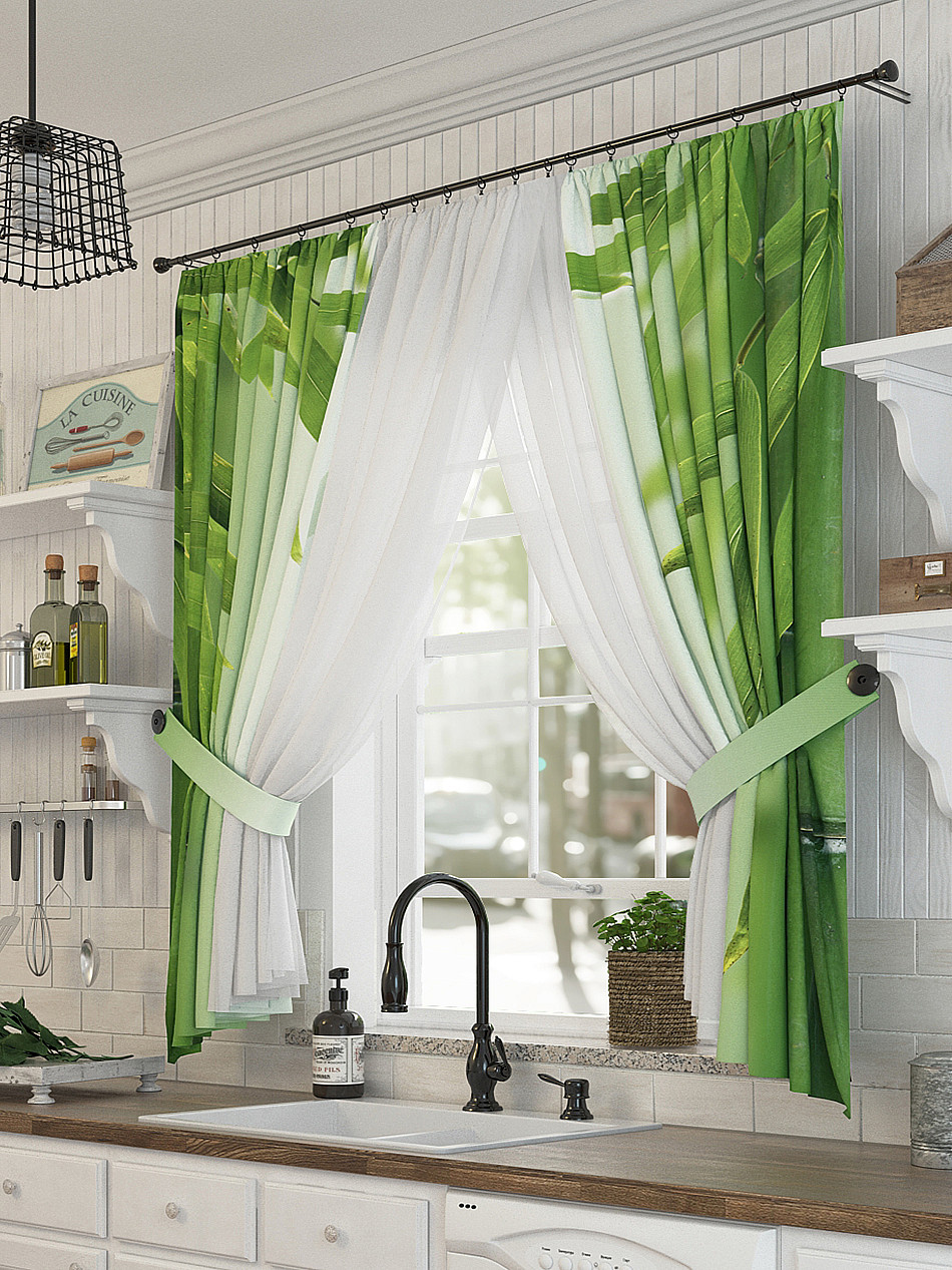 В тренде в последнее время и экзотика. Стильные бамбуковые шторки прекрасно украшают кухонные окна комнаты, выполненной в любом стиле. Бамбуковые шторы обычно стоят дороже простых жалюзи, поскольку чаще всего создаются вручную. Такие шторки состоят из тонких бамбуковых палочек. Сшивают все эти детальки вручную.