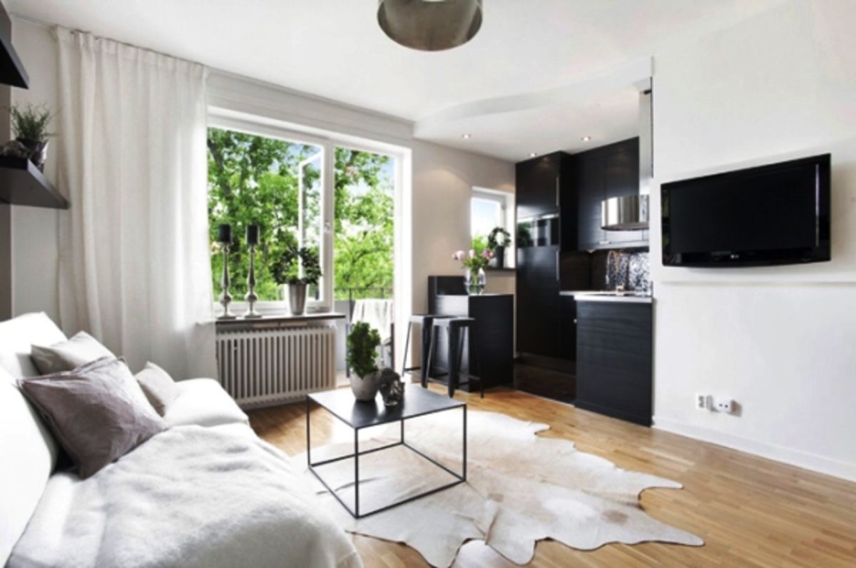 дизайн интерьера совмещенной комнаты с небольшой кухней в квартире