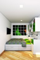 Однокомнатная площадь предполагает наличие складывающегося спального места, подняв которое, можно увидеть снизу шкаф для книг, либо удобное рабочее место.