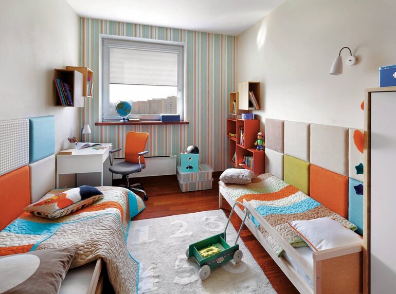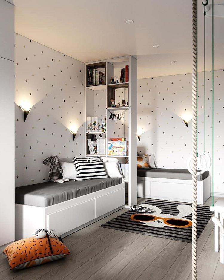 Он шикарно подходит для детей с небольшой разницей в возрасте, которые любят проводить время за играми вдвоем. Будет достаточно установить раздельные кровати, оставив остальную комнату для детских игр.