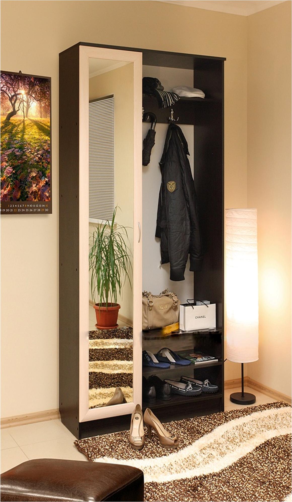 Особенность конструкции шкафа-колонки в том, что он достаточно узкий, чтобы уместиться в помещении, где необходимо экономить пространство. Многообразие моделей позволяет выбрать нужную именно для ваших целей. - Если места совсем мало, лучше отказаться от шкафа и громоздких конструкций. Достаточно будет оставить несколько крючков для верхней одежды. Оставшуюся площадь можно обставить модульной мебелью. Допустимо использование подвесных конструкций. Например, будет уместным расположить на стене стеллаж под книги, косметику, комнатные цветы, фотографии или модные аксессуары. Зависит от предпочтений домочадцев.