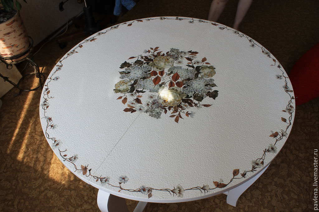 В данной ситуации расставаться с мебелью не обязательно. Стол можно декорировать салфетками. Для этого необходимо ознакомиться с техникой декупажа.