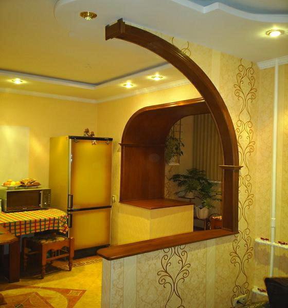Подобная конструкция требует наличия широкого проема между комнатами, чтобы кроме стойки оставалось место для прохода. Есть возможность создавать симметричные и асимметричные формы, с колоннами, полками, из натурального дерева или современной отделкой.Можно, используя недорогие материалы, создать фигурную арку в средневековом стиле с рамкой, имитирующей каменную кладку.