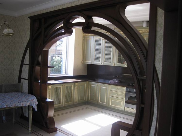 Натуральное дерево позволяет создать наиболее изысканное и престижное оформление арки между гостиной и кухней. Несмотря на дороговизну материалов и монтажа конструкции, получается великолепное решение в дизайне интерьера. Такая арка максимально прочная и долговечная. Поверхности могут иметь великолепные рельефные изгибы, быть покрыты качественным лаком.