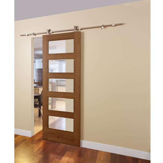 В этой раздвижной двери используется встроенная система крепления, которая скрывает направляющую над дверью. Идеально подходит для тех, кто хочет иметь наименьший визуальный след.