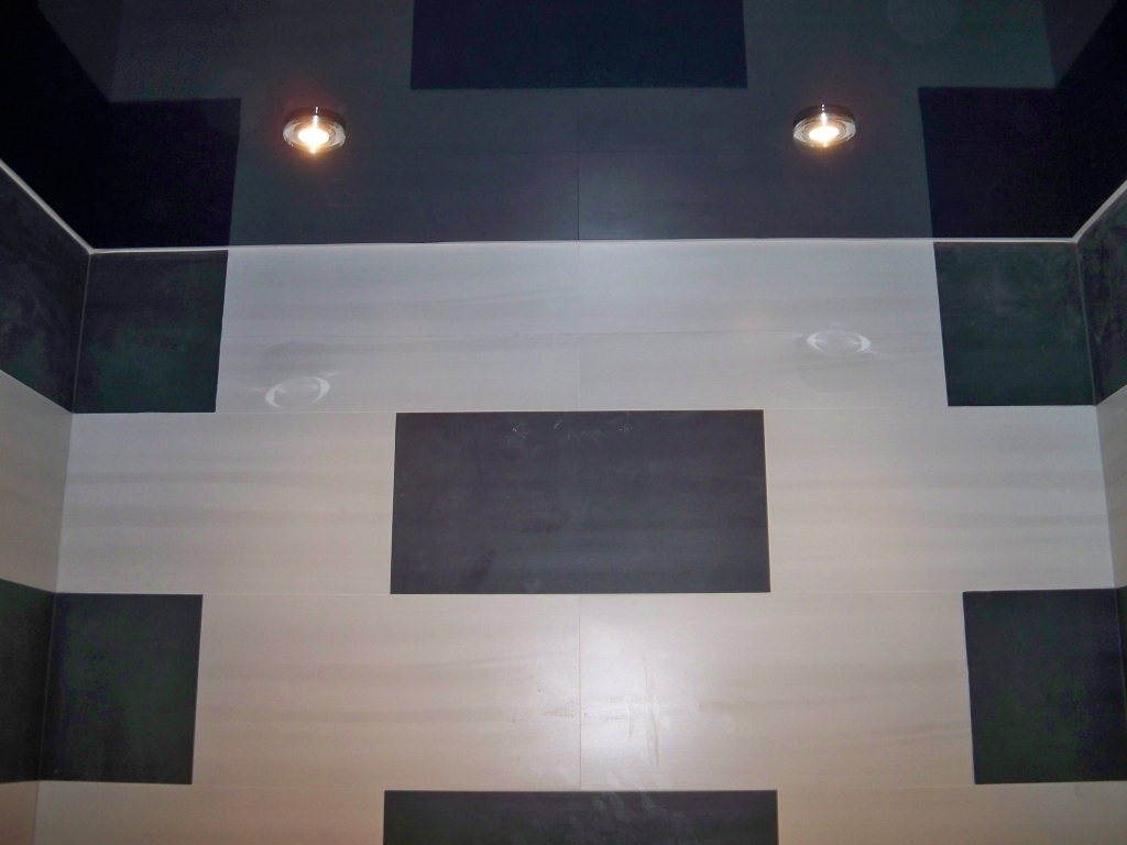 Блестящая потолочная поверхность отлично сочетается с матовыми стенами. Разбавить интерьер можно угловыми вставками, усиливающими эффект монохромности. В оформлении дизайна можно использовать светлую плитку на полу. Дополнительно устанавливают цветные предметы мебели.