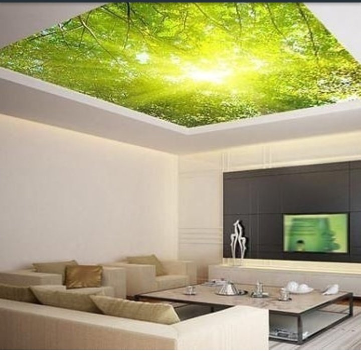 Зелеными могут быть не только стены, но и потолки. Благодаря использованию натяжных конструкций можно оформить потолок очень быстро.