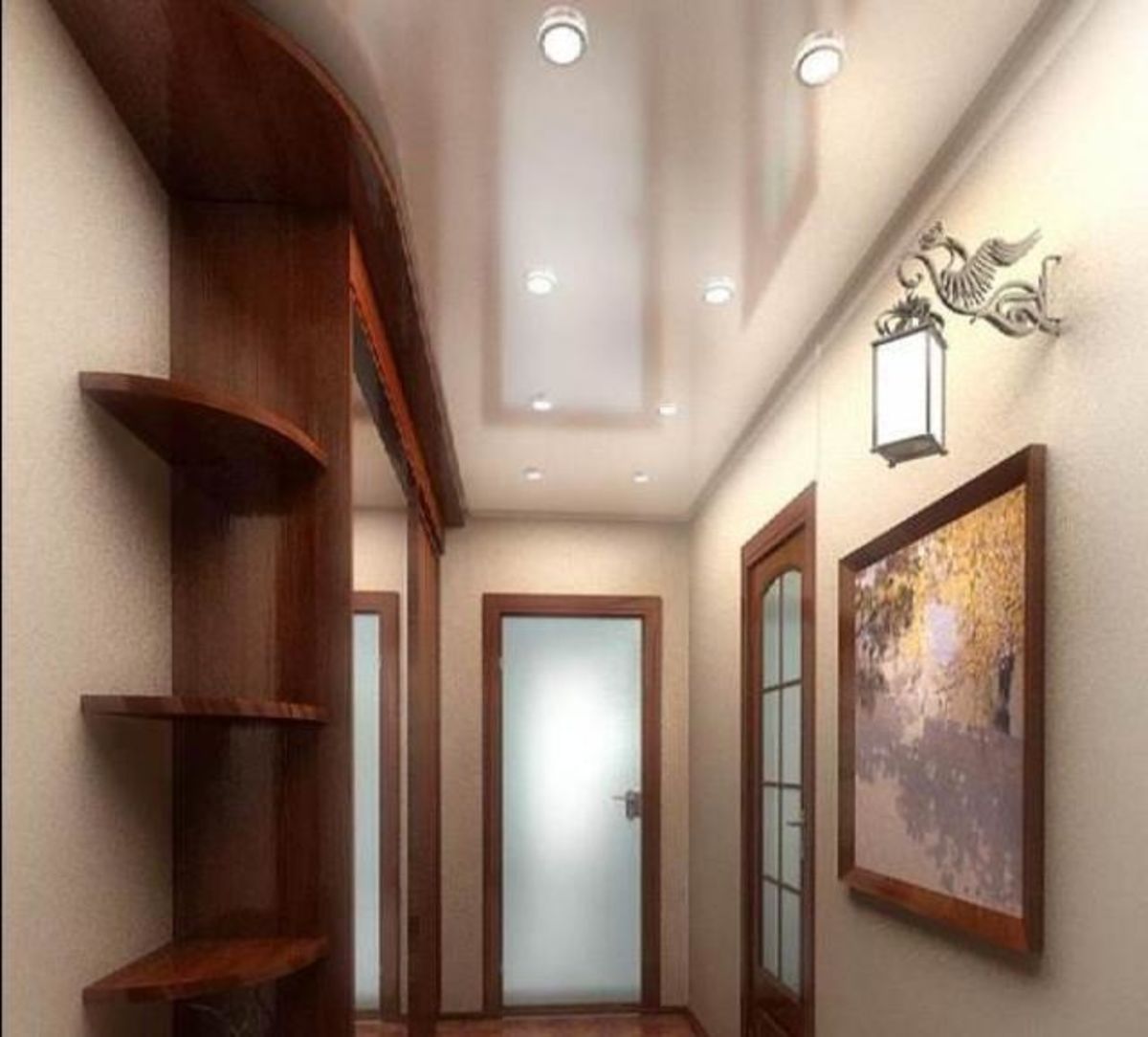 Если же коридор крохотный, то для такого малогабаритного помещения настоящей находкой станут глянцевые натяжные полотна.