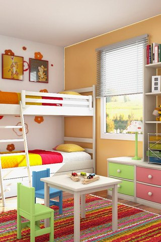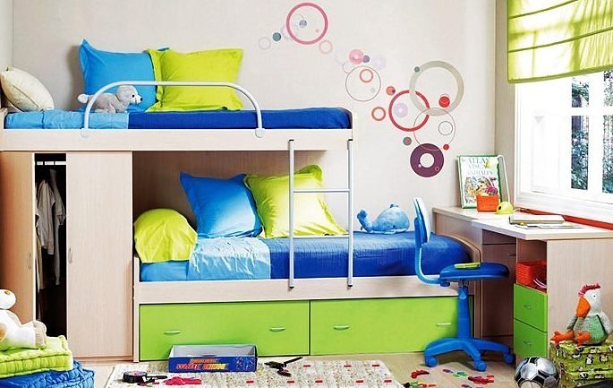 Интерьер детской комнаты для двоих может включать в себя вместо двух отдельных кроватей двухъярусную кровать, тогда один из детей спит внизу, а другой наверху. Если дети не могут договориться о том, кто из них на каком ярусе будет спать, можно предложить им время от времени меняться местами.