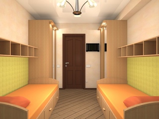Беспроигрышный вариант в данном случае – двухъярусная кровать. Под такой кроватью может находиться выдвижной ящик для постелей, ступеньки на второй ярус могут являться одновременно небольшими шкафчиками.