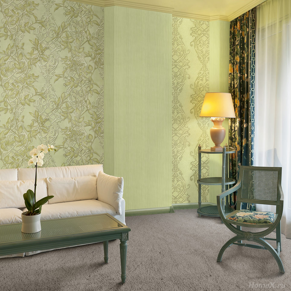 Зеленый тон обоев компаньонов будет удачно смотреться с теплыми природными оттенками, такие как коричневый, серый, оранжевый, кремовый, золотистый и черный. Эко тематика сделает интерьер теплым, а атмосферу успокаивающей.