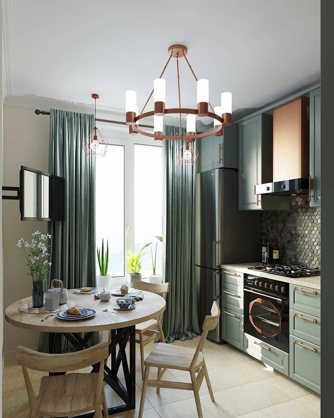Все это поможет сформировать более комфортную атмосферу в интерьере кухни 9 кв.м, правильные комбинации способны полностью стереть ощущение стесненного помещения.