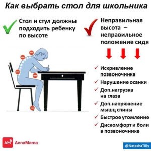 - Правильное расстояние от рабочей поверхности до глаз должно быть равно длине от локтя до кончиков пальцев ребенка.