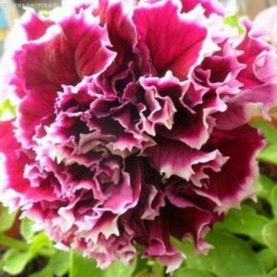 Цветки густомахровые, до 10-12 см в диаметре. Лепестки гофрированные, как правило, двухцветные: красные, пурпурные или розовые с белой каймой. Высота куста в среднем 30-35 см.
