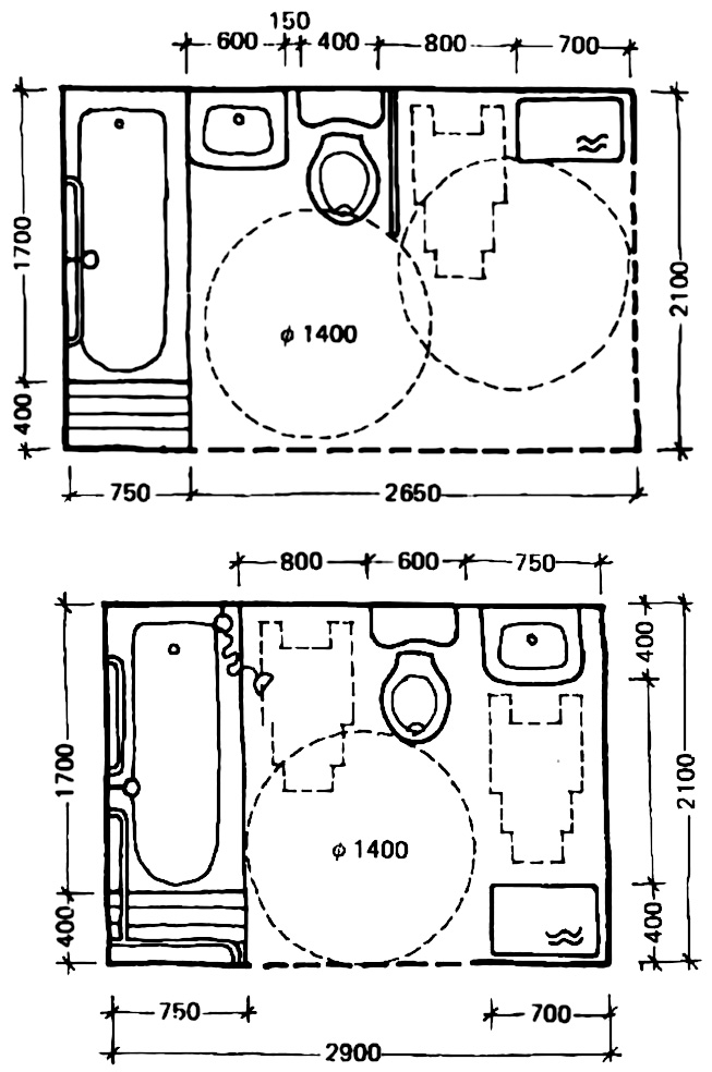 Радиальное расположение сантехники в помещении 4 кв. мВ почти квадратных санузлах ванну можно разместить вдоль стены напротив двери (план ниже) либо по смежной стороне (на схеме стена справа). В таком случае унитаз и раковина переносятся на дальнюю стену, а слева останется место для машинки и шкафа.