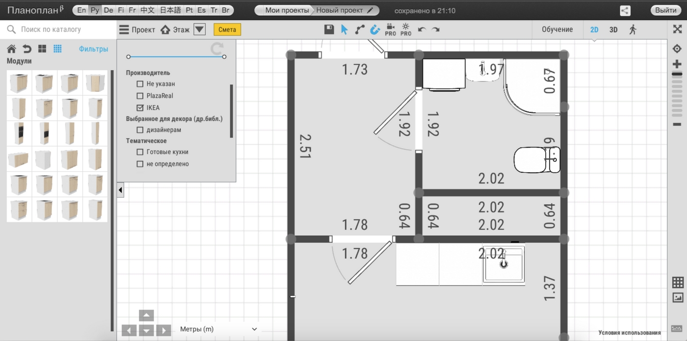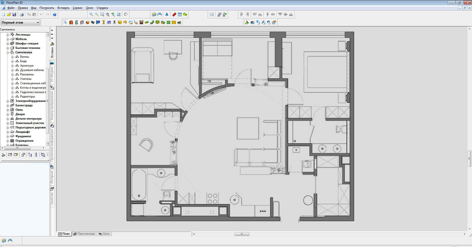 Программа представлена в двух вариациях бесплатной и платной. Вторая разновидность оснащена расширенными функциональными возможностями. Сервис позволяет составить проект высокого качества в трехмерной модели. Пользователь может спланировать обстановку, цветовую гамму, размещение мебели. Из недостатков лишь недостаточное количество объектов.