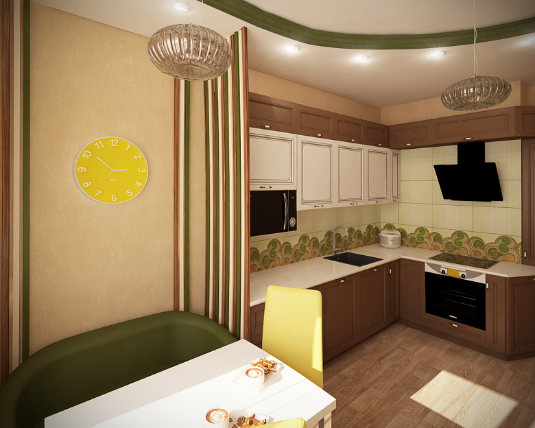 - Комната прямоугольной формы, разделенная полуостровным гарнитуром и кирпичным «фартуком». Четкое зонирование на кухню и гостиную с помощью углового дивана и круглого стола. Зона отдыха располагается у окна, украшенного шторами, настенными бра и картинами. Кофейно-фисташковая гамма и приглушенное освещение создают вечернюю атмосферу. Этот вариант подойдет для тех, кто меньше всего времени тратит на приготовление пищи, а ужин предпочитает проводить в непринужденной обстановке.