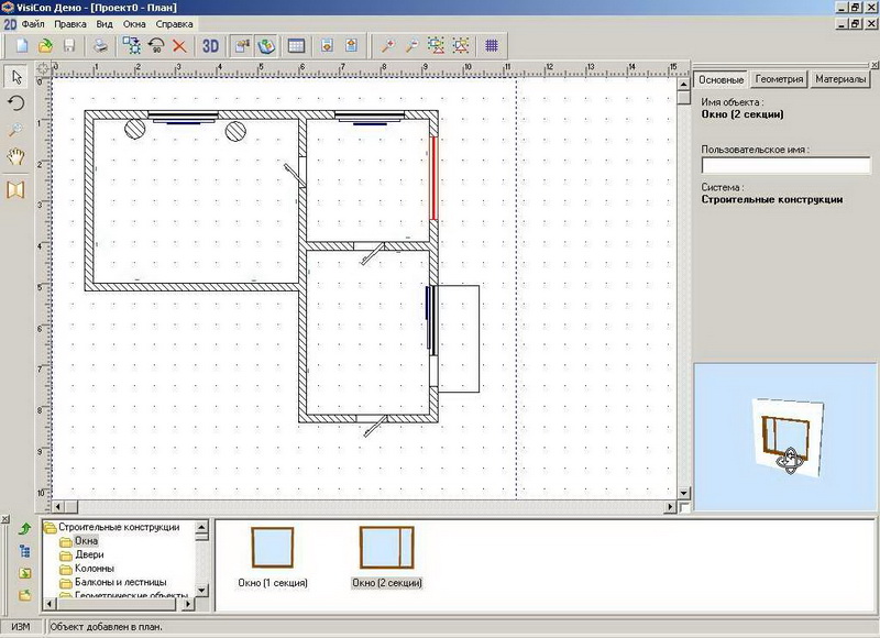 А в нижнем левом углу открывается меню и окно настройки активного объекта, над которым вы в данный момент работаете. Это может быть стена, окно, дверь, материалы для отделки, предметы мебели и декора.