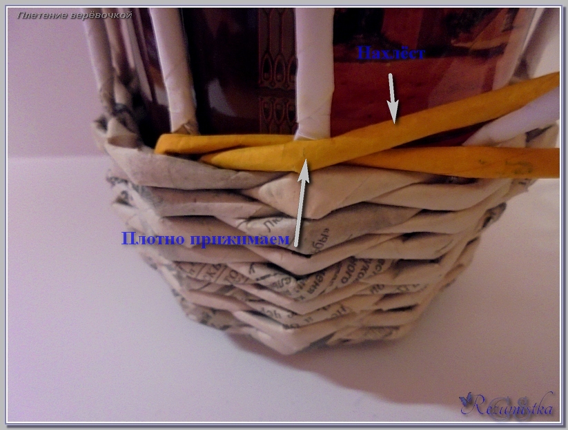 Вот, собственно и все — это способ плетения из газетных трубочек «веревочка». Уже с использованием этой техники можно делать самые простые вещи. Изделие получается плотное и прочное. Один важный момент: чтобы этот узор нормально смотрелся, стоек должно быть нечетное количество.