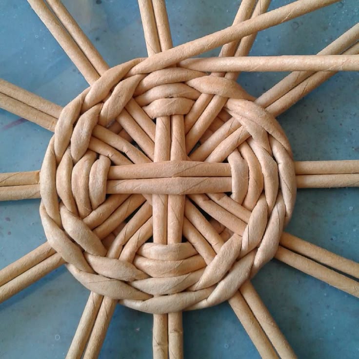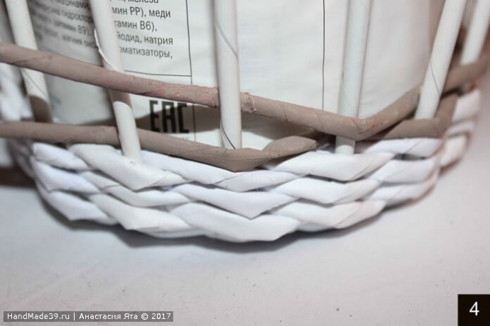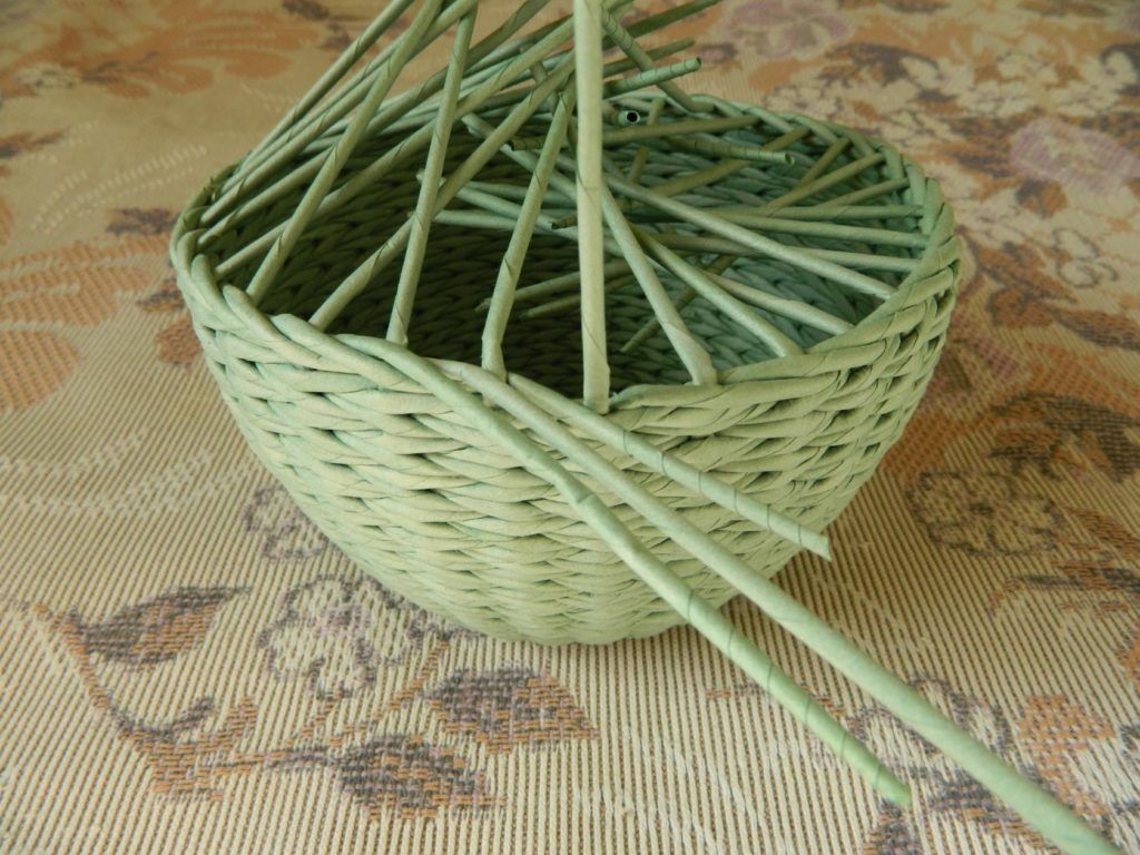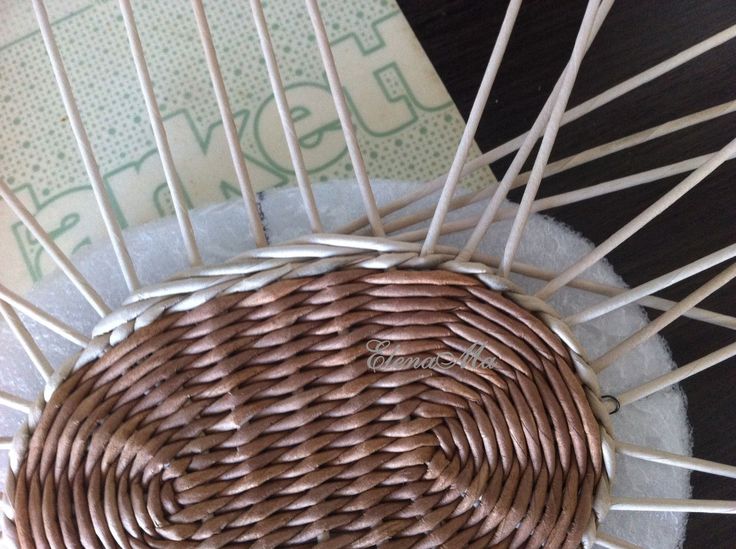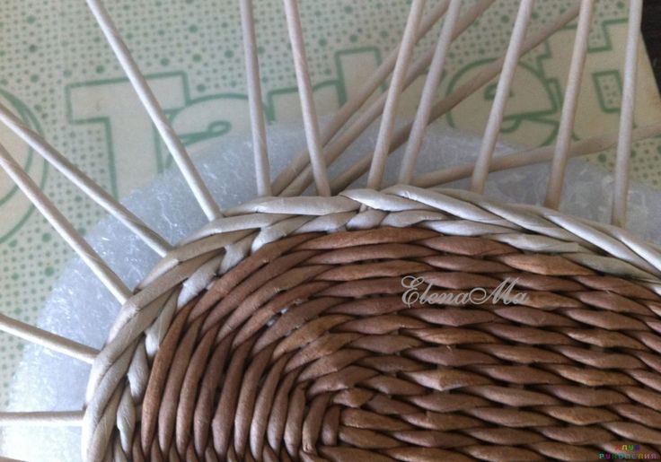 Заканчиваем плести дно и переходим на стенкиПри переходе на плетение стенок, трубочки основы перекрещиваем одну с другой. Так изделие получается более устойчивым и переход более надежным. Для плетения стенок можно использовать рабочие трубочки, которые применяли при плетении дна.