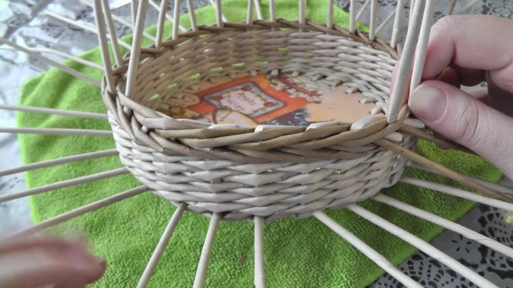 Второй вариант — сплести донышко из газетных трубочек. Понадобятся длинные трубочки — срощенные из двух или трех. Способов много, взяты они, в основном, из плетения из лозы. Принцип один — трубочки по одной или группами — переплетают между собой, формируя центр. Затем, используя некоторые из «лозин», оплетают основу, добавляя размер или придавая более округлую форму, если это необходимо.