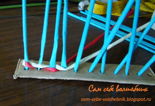 Далее, берем крайнюю правую из трубочек, которые находятся снизу. Загибаем ее, обводим вокруг, трубки то сверху, то снизу. Второй ряд — сразу плетем веревочкой через одну трубку.