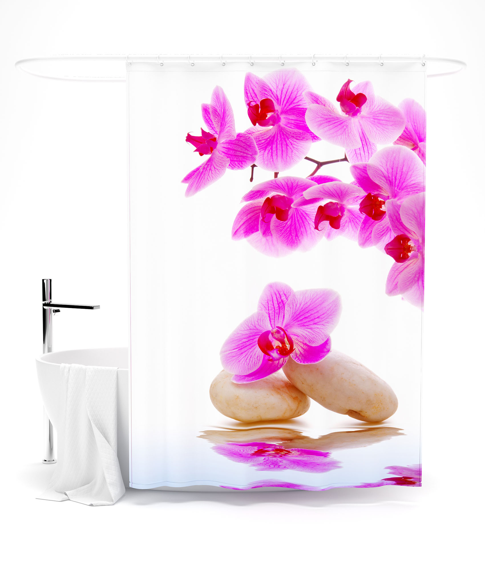 Если на выбранном вами рисунке присутствует несколько оттенков орхидей (розовый, голубоватый, светло-серый), их также с успехом можно применить в отделке ванной комнаты.