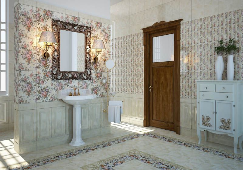 Акцентами можно сделать керамическую плитку с орнаментальными узорами из цветов, а также с изображением натюрмортов и пасторальных сцен.