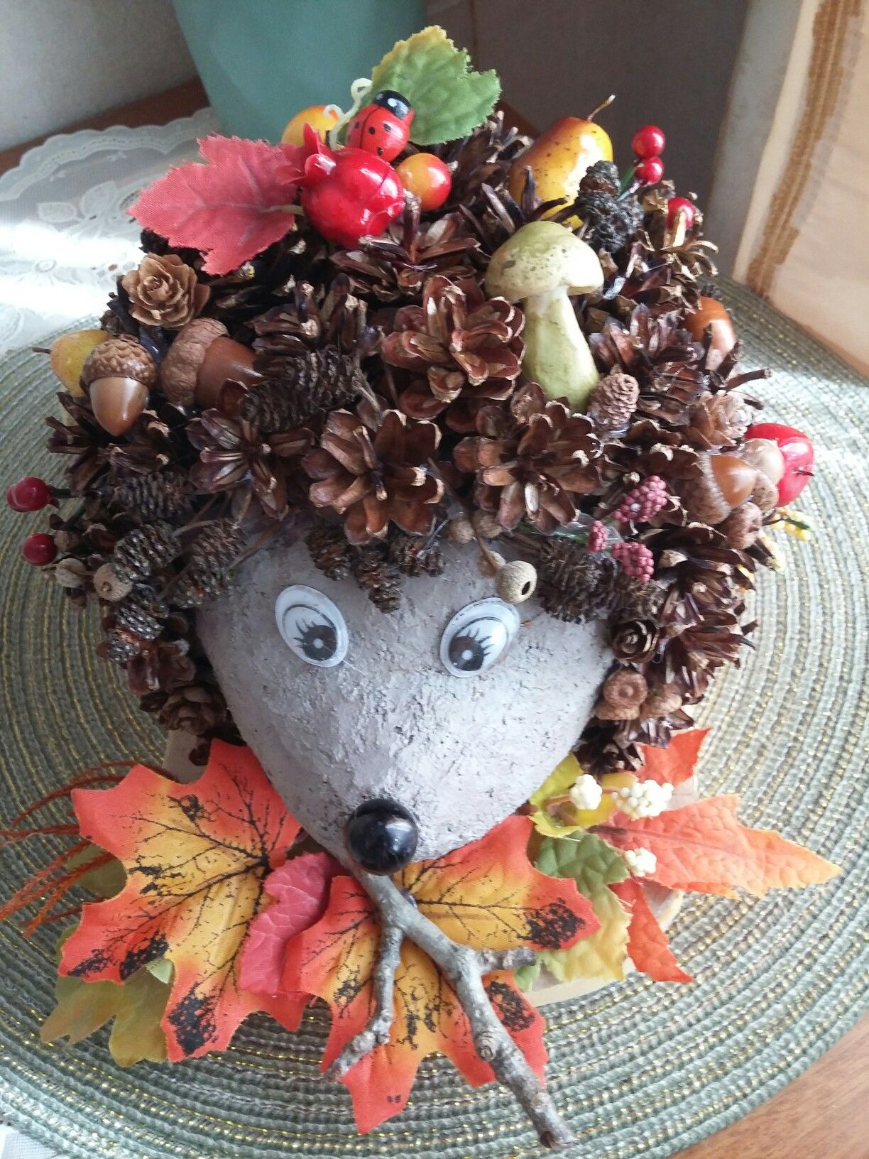 Когда вся поверхность с тканью покрыта шишками осталось приклеить ежику глазки и ушки из бумаги. Закрепляем на спинке ежика яблочки, орешки, рябинку и веточки. Осенний ежик из шишек — готов!