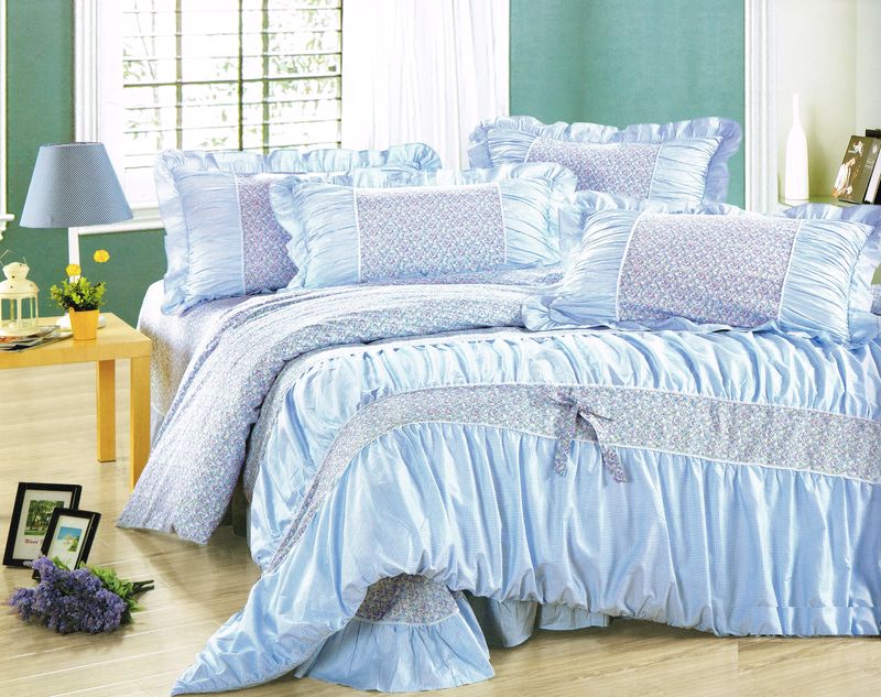Интересным будет оформление в технике пэчворк или лоскутного шитья. Предметы для сна, которые выполнены в такой технике, никому не покажутся унылыми. Цветочные узоры на приглушенном фоне разбавлены оборками из того же материала или похожим по виду.