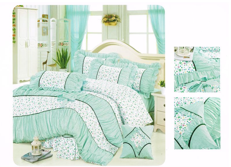 К ним относятся пуговицы и ленточки.Набор белья может сочетать в себе различные виды орнаментов. Каждая из подушек может быть оформлена по-своему, но расцветки должны быть сочетаемые. Ещё, как вариант, применяется комбинирование расцветок в одном предмете. К примеру, одна наволочка может быть выполнена в бирюзовую и белую полоску, а другая иметь белый рисунок по бирюзовому фону.