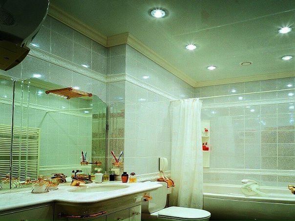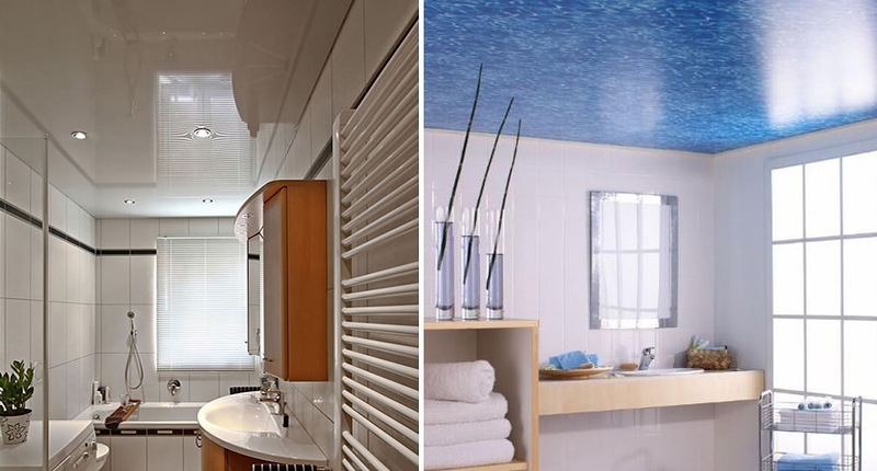 Ванная отличается от любых других комнат высоким уровнем влажности. Материал потолка здесь страдает, в первую очередь, от воздействия снизу: брызги душа, водяные пары, высокая влажность и «потеющие» трубы.